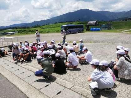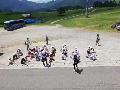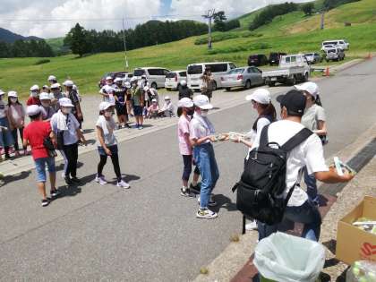 昼食のため集合です。弁当を受け取り、笑顔です。