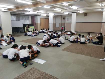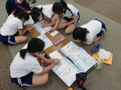 みんな集合が早く、予定より早く活動が進んでいます。家庭へのはがきを書いています。