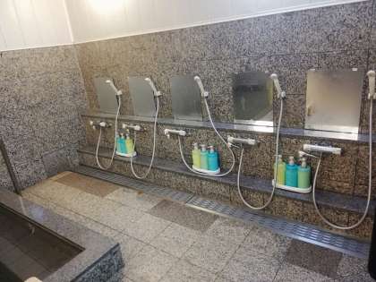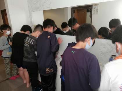 入浴が終わったのでお風呂場を紹介します。みんなさっぱりして、新しいお茶を入れてもらうため、水筒を洗っています。