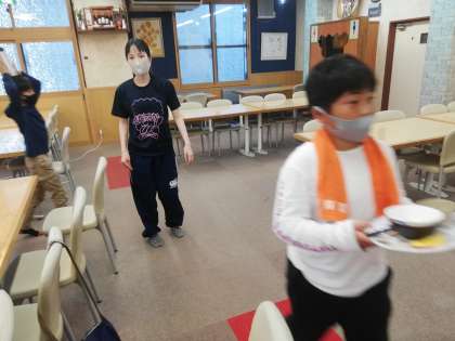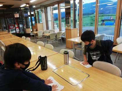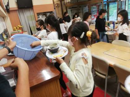 楽しい食事が終わり、後片付けです。テーブルをきれいにして部屋でくつろぎます。雨が降ってきましたので、キャンプファイヤーは明日に延期にし、室内ゲームに変更します。