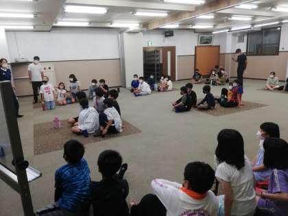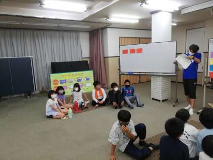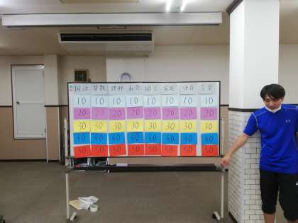 雨天のため、キャンプファイヤーが延期になり、多目的室でクイズ大会をしました。「パネルクイズ」です。活動班でパネルの教科と数字を選び、担任が問題を出して答えるゲームです。