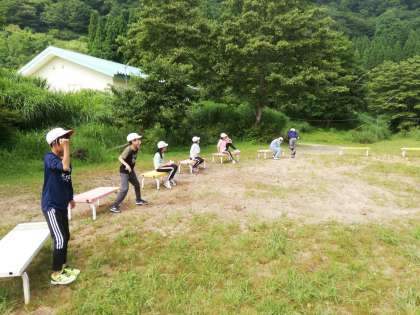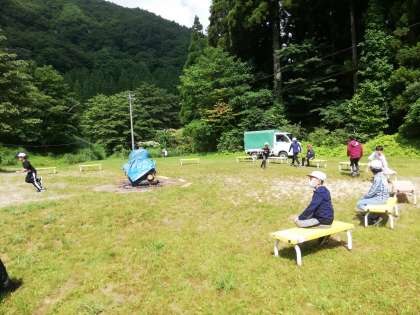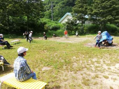 焼き板も早く終了しました。余った時間でキャンプファイヤーのサークルでフルーツバスケットを楽しんでいます。