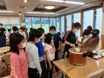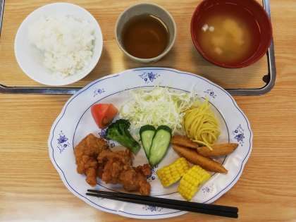 今日の夕食は唐揚げ定食です。ご飯を入れてもらい、いただきますを待ちます。
