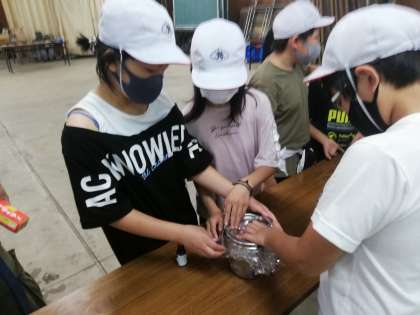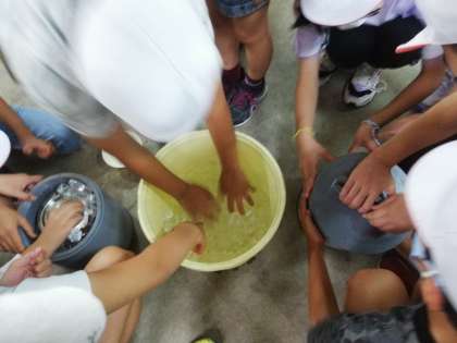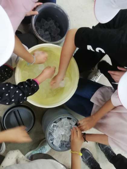 アイスクリームのもとを入れた容器にふたをして、回転用ドラムに入れて回りに氷と塩を入れてドラムにふたをします。