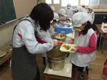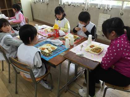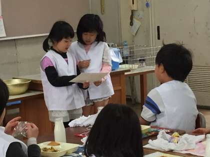 2年生は、給食の用意も自分たちでできます。献立の紹介もしっかりとできました。1年間の成長は大きなものがあります。