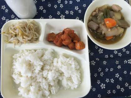 今日は、子どもたちが大好きなマグロのオーロラ煮でした。それにじゃがいもと野菜、こんにゃくの含め煮ともやしの甘酢和えがついていました。