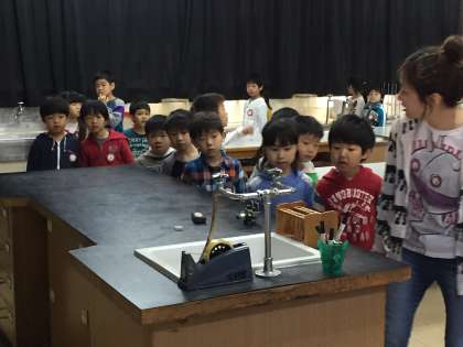 理科室には大きなつくえがあります。実験用具などもあって、楽しそうだなという顔をしていました。3年生になって理科の学習が始まったら、ここで勉強します。