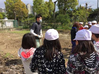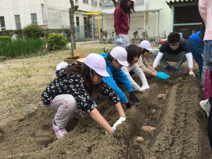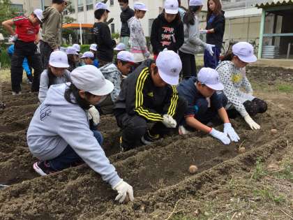今日の晴れ間をつかって、6年生はじゃがいもを植えました。あらかじめ、管理作業員さんが土を耕し、畝を作ってくれていたので作業は簡単でした。みんなでお礼を言いました。