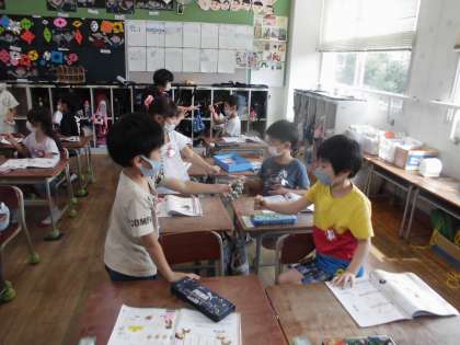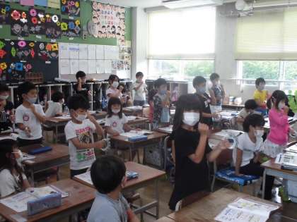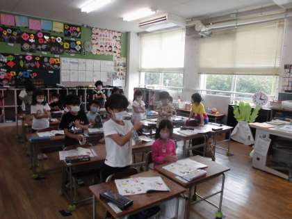 1年生は鈴、タンバリン、カスタネットといった打楽器を演奏しました。「ブンブンブン」や「かたつむり」など、習った曲を演奏しました。ジャンケンも取り入れ、楽しく学習していました。