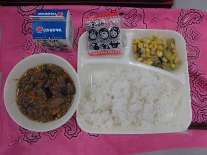 9月14日の給食は「マーボーなす」「ツナとチンゲンサイのいためもの」「いり黒豆」です。「マーボーなす」も「ツナとチンゲンサイのいためもの」もご飯にとても合う味付けでした。
