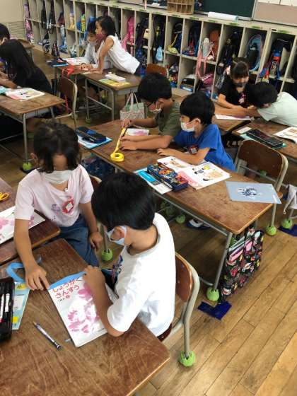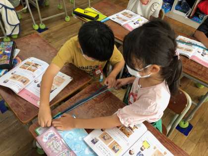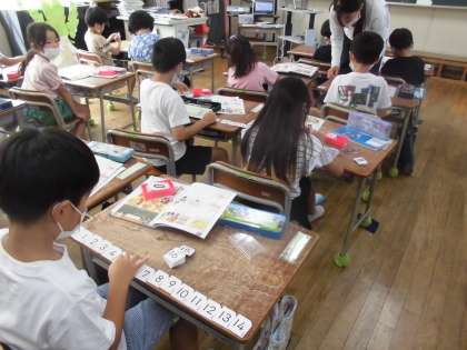 1年生は長さを比べる学習をしています。写真のように紙テープを使ったり、カードを並べて何枚分かを調べていきました。