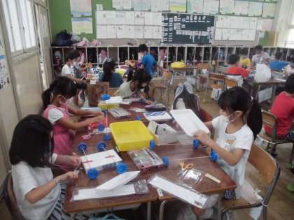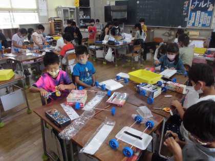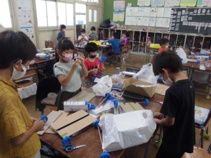2年生は工作で車を作りました。家庭から持ってきた空き箱や空き缶などを使って思い思いの車を完成させました。材料を上手に組み合わせて楽しい車が出来上がりました。