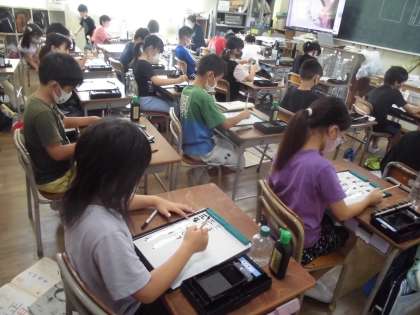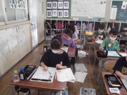 3年生は習字の学習で自分の名前を書く練習をしました。小筆を使ってていねいに半紙に書いていきました。