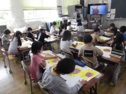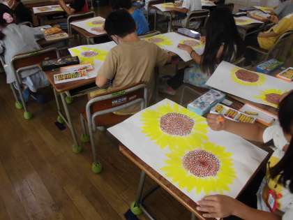 1年生はこれまで描いてきたひまわりの絵を仕上げました。画用紙に大きなひまわりを描き、教室いっぱいにひまわりの大輪が咲き誇りました。