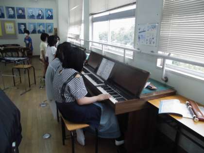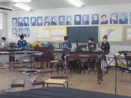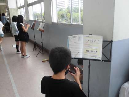 5年生は合奏に取り組んでいます。合奏の練習の合間にリコーダーのテストを一人ずつするため、密にならないように練習をしていました。