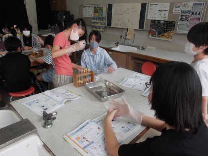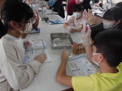 6年生は理科の実験をしました。今日の実験は水溶液の性質調べです。スポイドとビーカーを使って実験をしていきました。