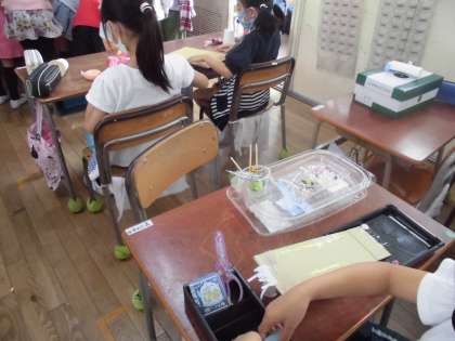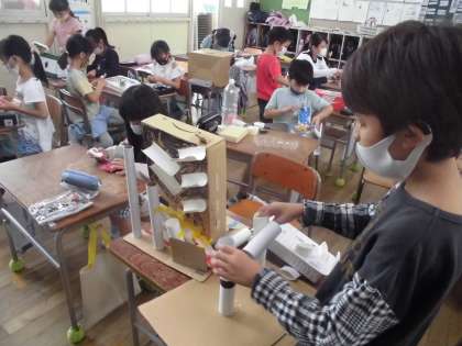 2年生はおもちゃ作りをしました。プラスチックや紙の皿やコップ等、材料を選んでアイデアを生かして作っていきました。