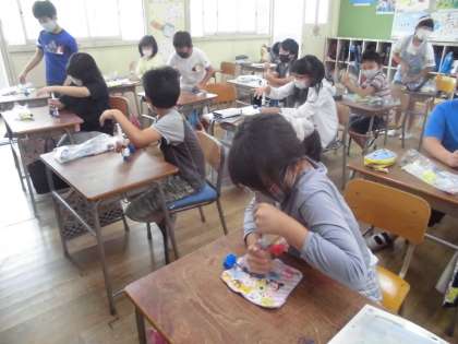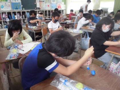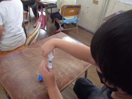 4年生は理科で空気と水について調べていきました。注射器状の実験用ピストンに空気を入れて手で押していきました。次に水を入れて同じように手で押して感触の違いを調べました。