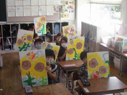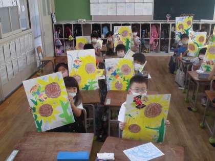 1年生はひまわりの種を観察し、ひまわりの学習を終えるにあたり、画用紙にひまわりの絵を描きました。画用紙いっぱいにひまわりの花が咲き、色も鮮やかで素晴らしい出来栄えです。