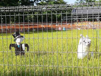 5年生作成のかかしが住吉大社の御田に立ちました。