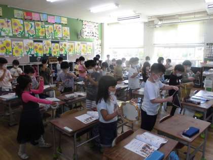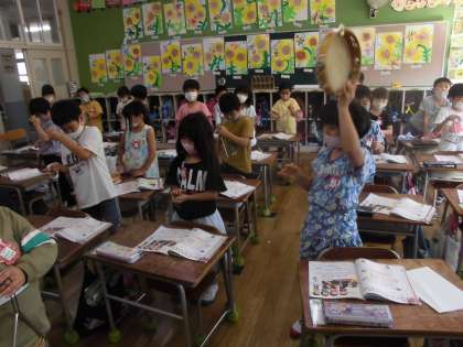 打楽器の演奏、ラジオ体操を覚えよう(1年生)