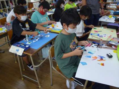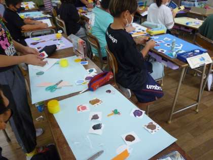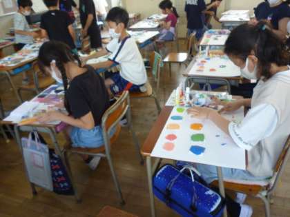 4年生は8センチ程度の画用紙の上で絵の具を指で混ぜ、色の変わっていく様子を確認していきました。その画用紙を大きな画用紙に並べて模様づくりをしました。