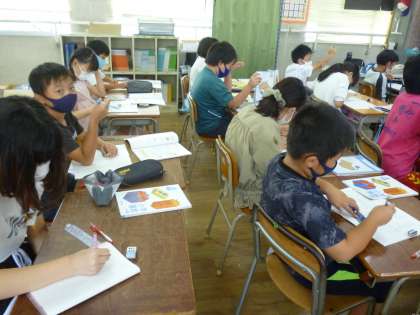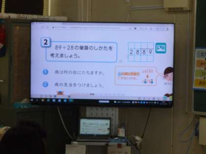 4年生は写真のように2ケタ同士のわり算に取り組みました。商の見当をつけ、正しい商をたてるのがむずかしい学習です。