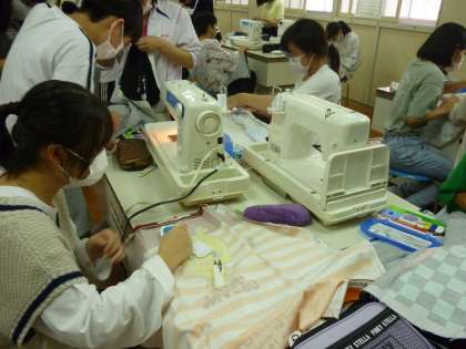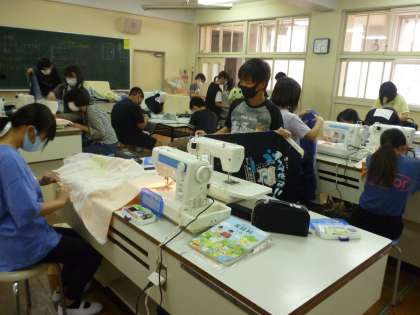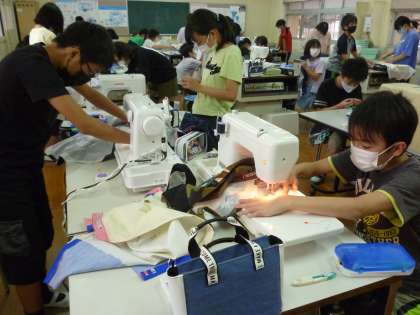6年生は家庭科でエプロン作りに取り組んでいます。待ち針を使って折り目を固定し、ミシンで縫い始めました。