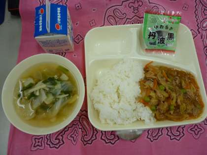 10月11日の給食は「ピリ辛丼」「中華スープ」「ソフト黒豆」です。「ピリ辛丼」は辛さをおさえて子どもたちが食べやすいように味付けされていました。