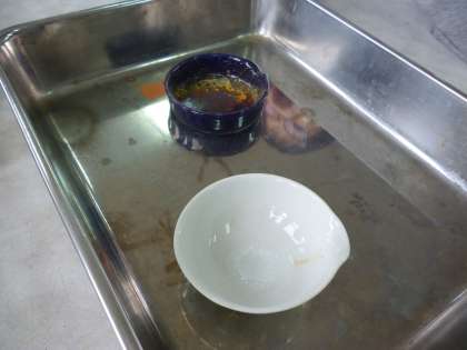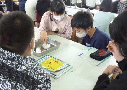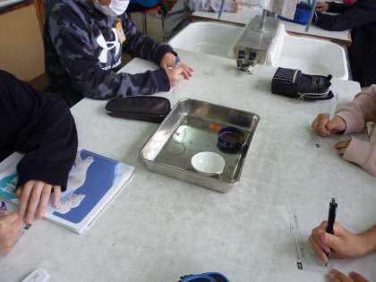 6年生は理科室で「水溶液の蒸発実験」をしています。片方には鉄、片方にはアルミニウムがとけていました。出てきた固体の色の違いなどがしっかり観察できました。