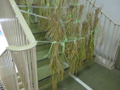5年生は、今日は学習園で育てた稲を刈り取りました。大切にお世話をしたのでたくさんの稲穂が実りました。刈り取った稲は階段をうまく利用して、「はざかけ」をしています。おかげで、廊下は藁のいい匂いに包まれています。