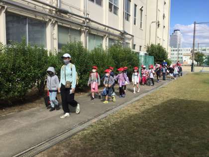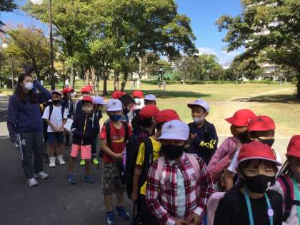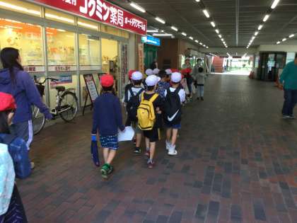 2年生は第1回目の町たんけんに出かけました。広場でグランドゴルフをしていた地域の方々に声をかけていただいて、元気にポートタウン東駅のほうに向かいました。