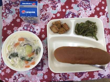 ハクサイのクリーム煮、厚揚げのごまじょうゆかけ、豚肉とさんどまめのオイスターソースいためです。クリーム煮がとろっとしていて、とても体が温まりました。