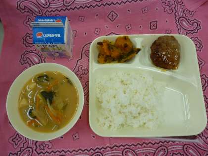 和風ハンバーグ、豆腐の味噌汁、カボチャのいとこ煮です。いとこ煮のあずきが甘くてやわらかかったです。和風ハンバーグはやわらかくて、あま口ソースが美味しかったです。