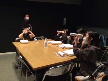 万華鏡が出来上がったらライトに照らして、みんなで見せ合いをしました。
