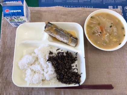さんまのみぞれかけ、みそ汁、牛ひじきそぼろ、ごはん、牛乳です。