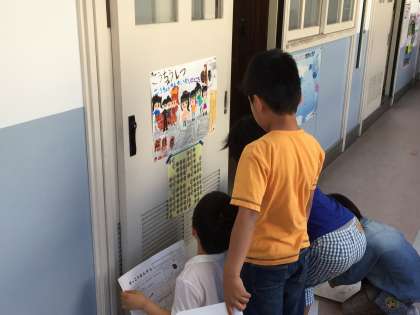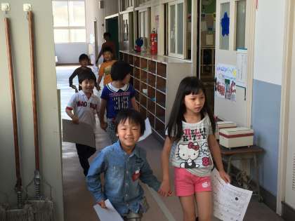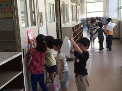 去年は案内してもらう立場だった2年生。1年たって、りっぱなお姉さん、お兄さんになりました。今日は、1年生をつれて校内たんけんをしました。