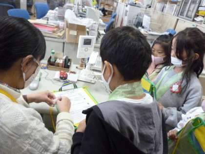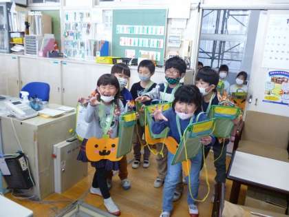 今日は、Happy Halloweenの日です。1年生はみんなで、カボチャのおばけを作って「I’m a monster,trick or treat.」と言いながら、職員室や管理作業員室などをまわりました。それぞれのお部屋で、キャンディの代わりにシールやスタンプをもらって大喜びでした。