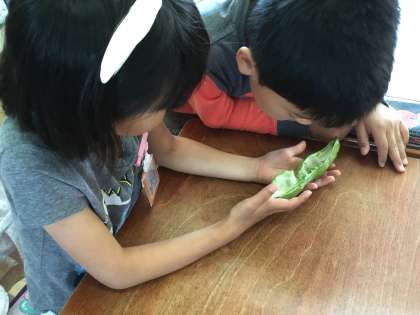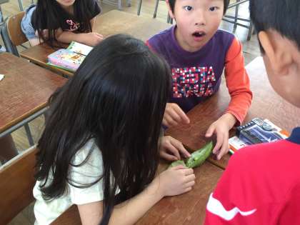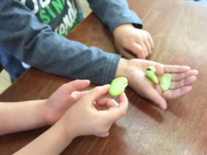 2年生は、国語学習に入る前にそら豆の観察を行っていました。子どもたちは、そら豆を実際に見たり、触ったりした経験がありませんから、大きなさやに入っているとは思っていません。においをかいだり、触れたりして学んでいきます。