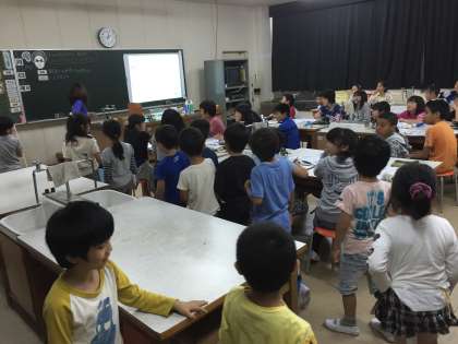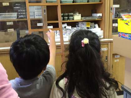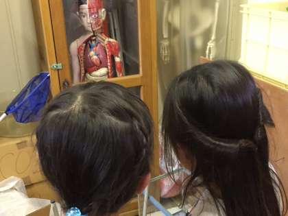 1年生が理科準備室を探検しました。人体模型やたくさんの実験器具を見ました。ちょっぴり怖そうにしている子もいました。6年生の理科学習を参観して、おもしろそうだなという顔をしていました。