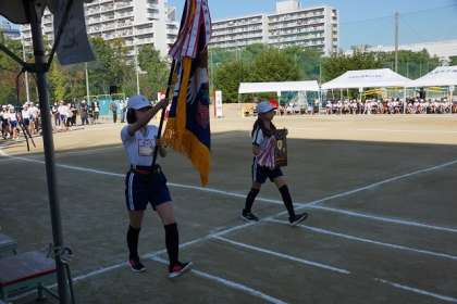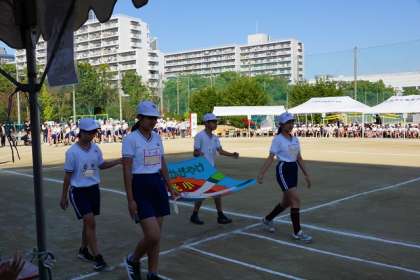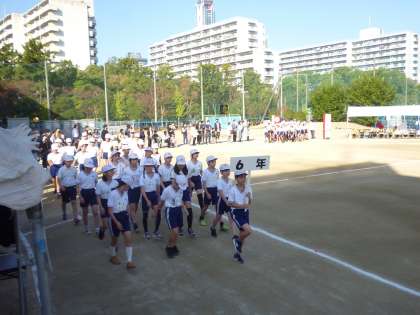 11月7日は多くの保護者の皆さんに来校いただきありがとうございました。その時の様子を順次紹介していきます。まずは開会式です。校旗、優勝旗・準優勝盾を先頭に5年生、6年生が入場しました。