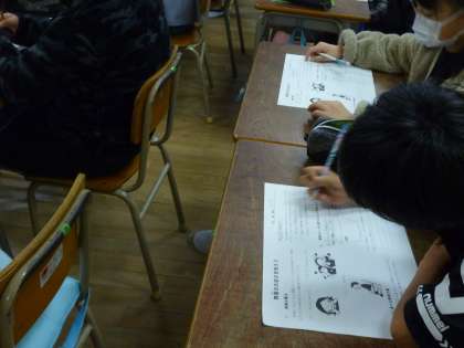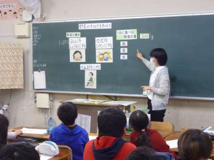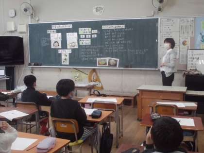 4年生は他校の栄養教諭の先生から栄養について教えていただきました。テーマは「野菜の大切さについて知ろう」です。授業のまとめでは「オリジナルの豚汁を作ろう」という内容で野菜たっぷりの豚汁献立を考えました。