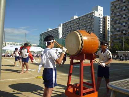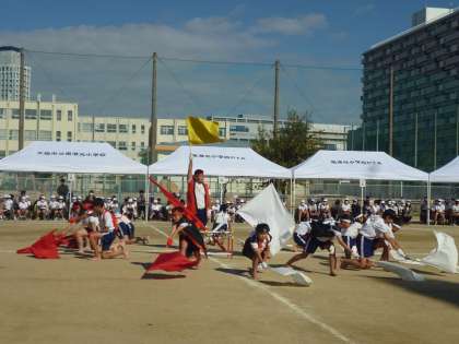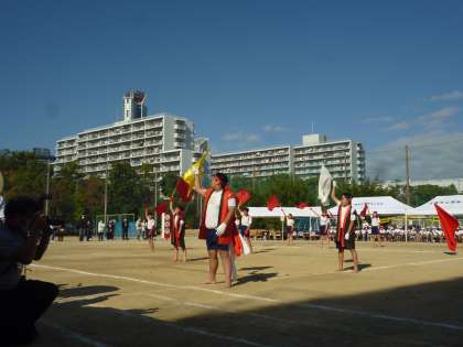 運動発表会は全学年の徒競走が終了しました。ここで応援団の登場です。5年生と6年生の希望者で結成しました。毎日、練習に取り組み、朝練習もしていきました。堂々とした演技で大きな声でみんなを応援しました。