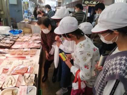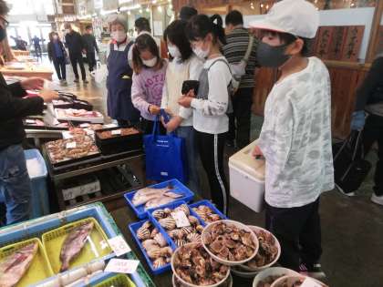 買い物を済ませ、テラスで休憩です。買った魚を見せ合いして、楽しんでいました。