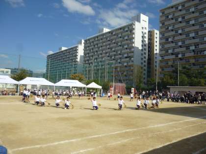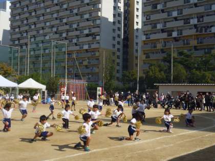 次は1年生と2年生の団体演技「はたらく ひかりっこ細胞」です。1年生は金色のポンポンを持って踊りました。かわいい踊りに大きな拍手をいただきました。