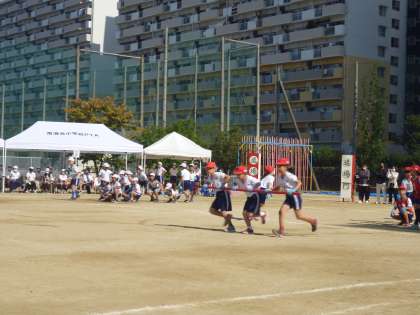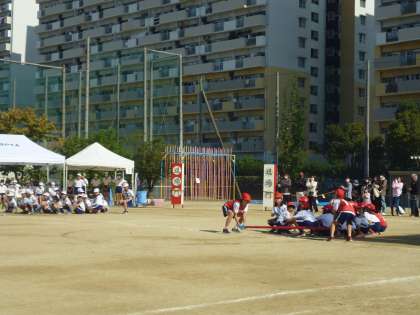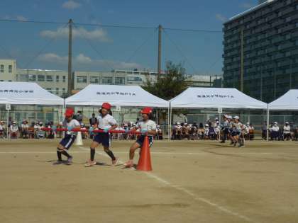 次は団体競技です。まず3年生の「くるくるタイフーン」です。棒の外側と内側では回転の仕方が違うのでチームワークが大切な競技です。練習の成果を出してがんばっていました。