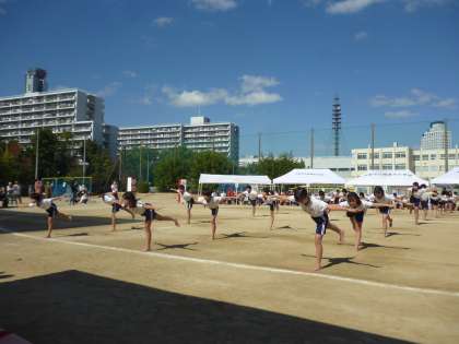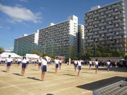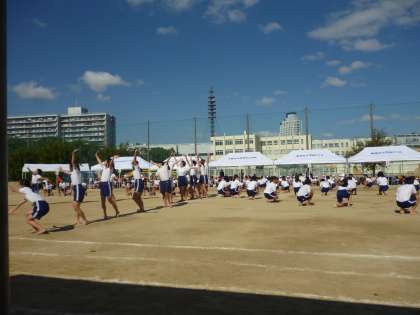いよいよフィナーレの5年生・6年生による団体演技「和・洋〜心をひとつに」です。緊張感がいっぱいの静まった運動場で演技が始まりました。