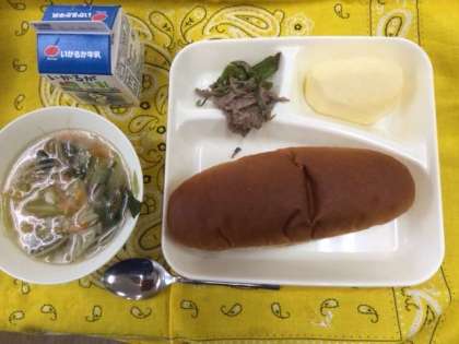牛肉のオイスターソース焼き、中華スープ、りんご、こくとうパン、牛乳です。