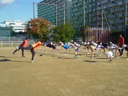 3年生は「NOBY]プログラムといって「よりよい走り方」を元陸上アスリートの方々に教えていただきました。今日は3回目で最終です。北京オリンピック・陸上男子4x100mリレーの銀メダリストの朝原宜治氏から直接指導いただき、子どもたちは一生懸命に走っていました。