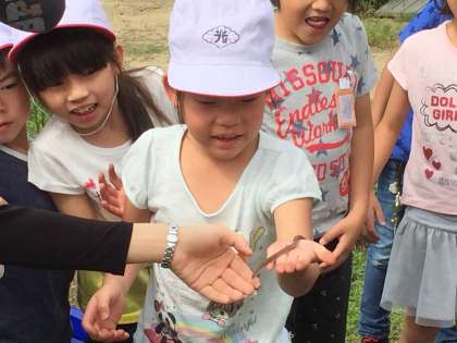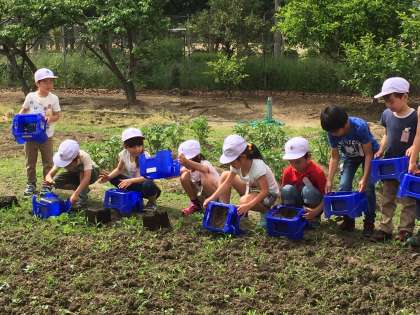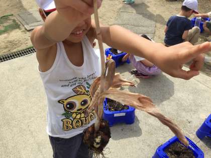 2年生は、1年生の時に植えたチューリップの後始末をしました。自分の鉢から球根をとりだして、花壇に土を返しました。中からおおきなみみずも現れました。